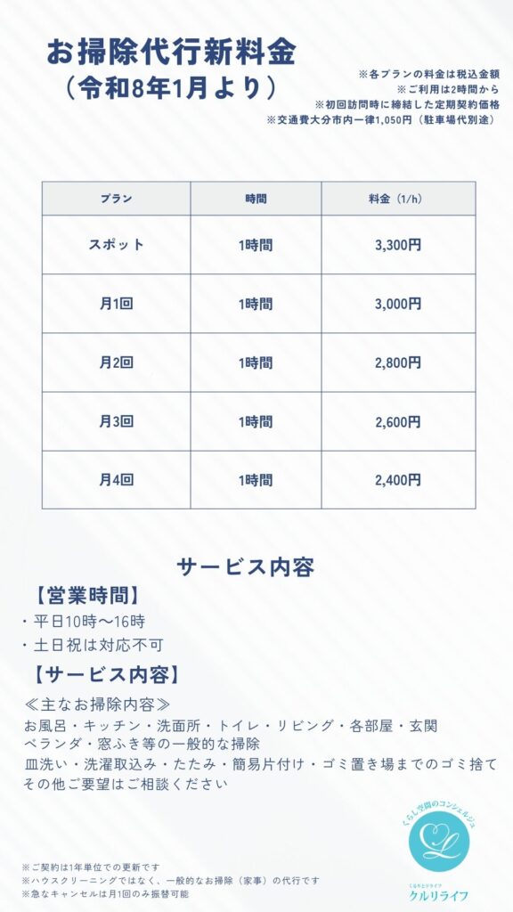 大変心苦しいのですが、令和8年1月より清掃代行サービスの料金および交通費を改定させていただくことになりました。